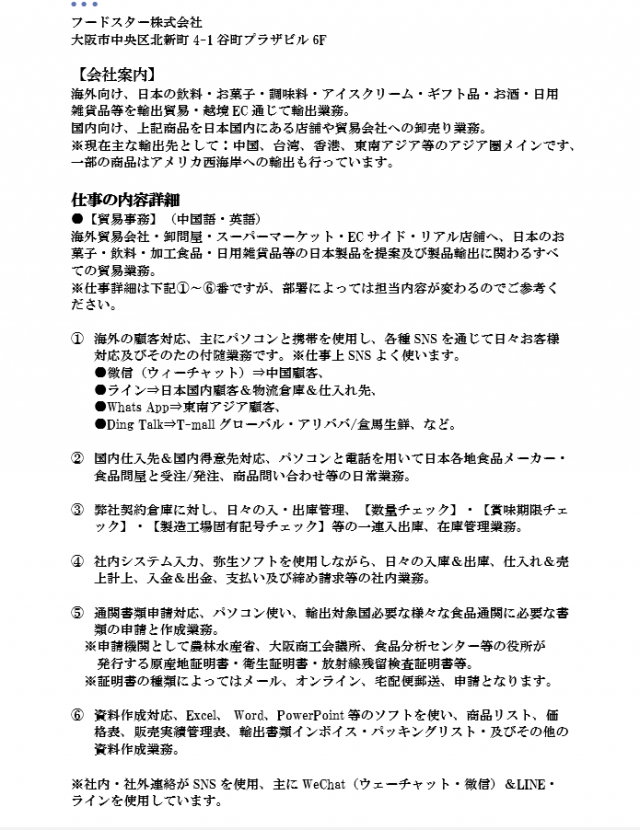 例:商品提案、見積作成、輸出書類作成、倉庫対応、通関業者対応など。